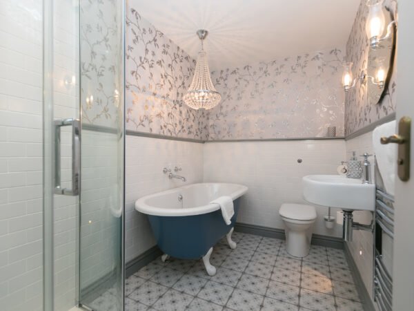 Bedroom one is more spacious out of the two, with a luxurious kingsize Hypnos pillow-top mattress, along with a sofa bed that can be made into two additional single beds. The en-suite features a roll top bath, lit by its own chandelier along with a shower and motion sensor low level lighting for those late-night trips to the bathroom! Draw open the curtains to make the most of the stunning countryside views through the big, beautiful arch windows.